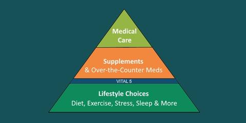 What makes a supplement a Vital 5 supplement? It’s a crucial nutrient we don’t get enough of in our diet, and when we do get enough, there’s actual evidence that it has some long-term benefit to one or more health issues. On our Wellness Pyramid, the Vital 5 fall here: