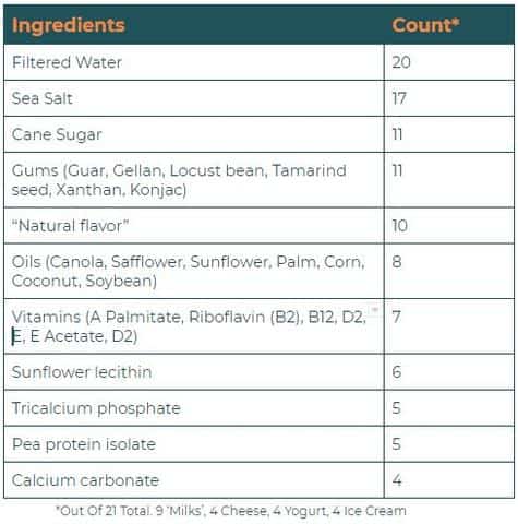 I had one of our team members review 21 different dairy alternatives. These were among the highest-grossing and most widely distributed products. We tallied up how many times which types of ingredients showed up on the “Other Ingredients” section of the Nutrition Facts Panel.